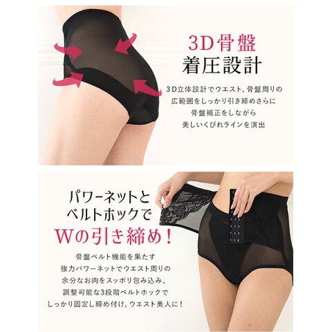 【3D骨盤 着圧設計】 3D立体設計でウエスト、骨盤周りの広範囲をしっかり引き締めさらに骨盤補正をしながら美しいくびれラインを演出 【パワーネットとベルトホックでWの引き締め】 骨盤ベルト 機能を果たす強力パワーネットでウエスト周りの余分なお肉をスッポリ包み込み、調整可能な3段階ベルトホックでしっかり固定し締め付け、ウエスト美人に! 【伸縮性のよいウエストゴム】 ウエストゴムを採用することでくるくる丸くならないため日常生活の動作時のストレスも解消! 【ショーツタイプで履きやすい】 普段使っているインナーやショーツの代わりとして履けます。